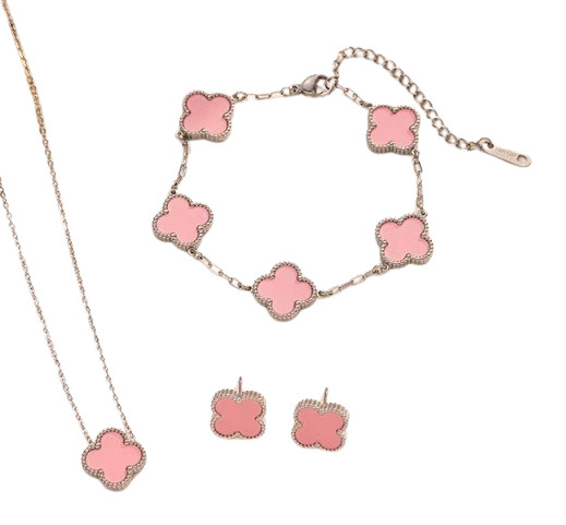 Ezüst Rózsaszín Színű Lóhere Nyaklánc, Fülbevaló, Karkötő Szett